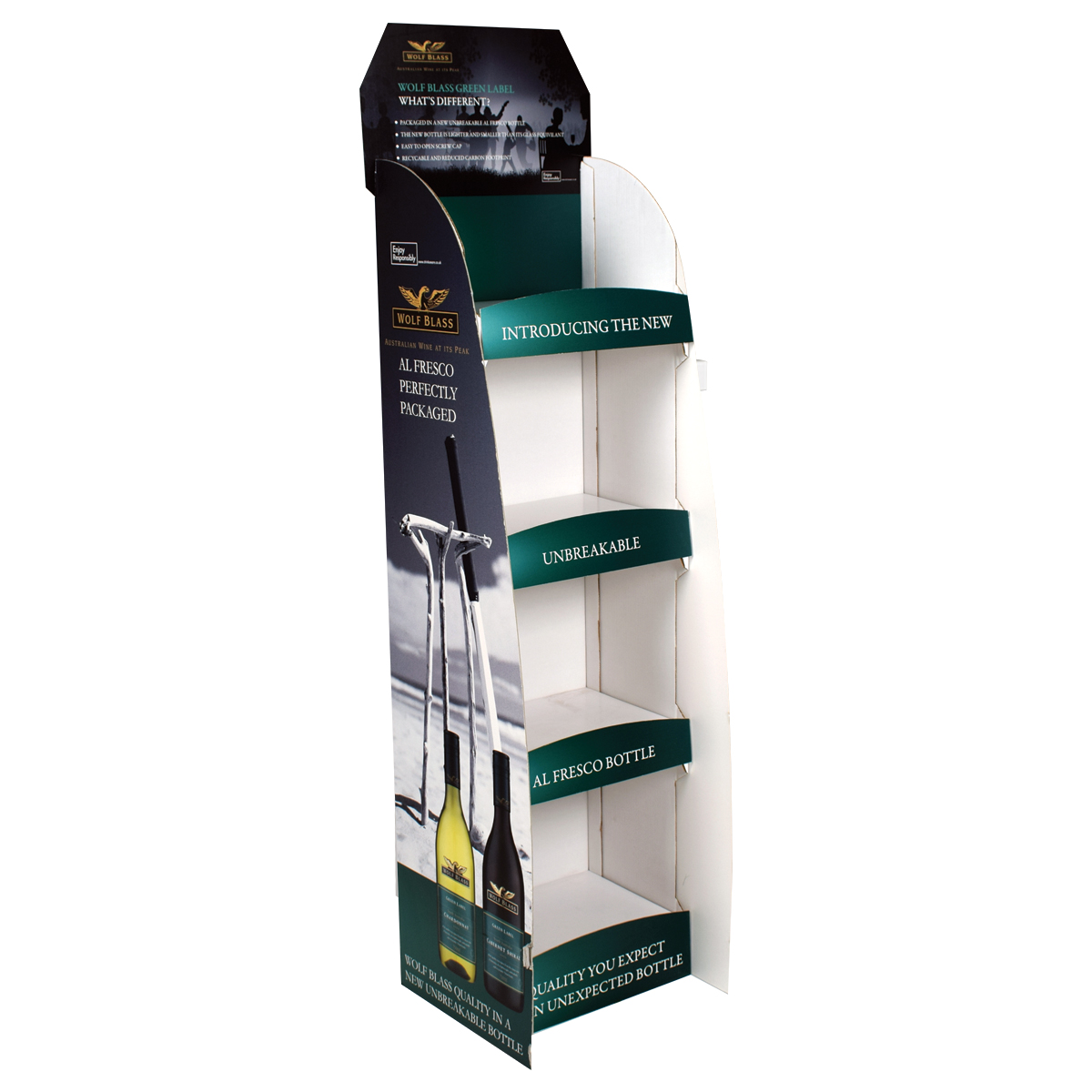 Elegant four shelf display with curved shelf headers and side supports and a generous promotional header.